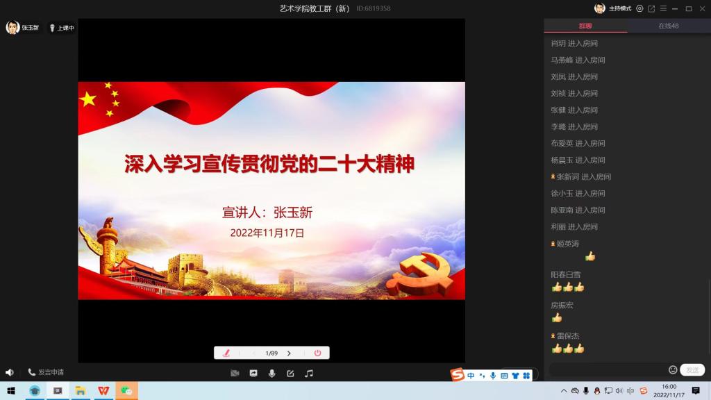 艺术学院党委副书记徐小玉以《学习党的二十大 让青春在党旗下闪光》为题,在钉钉会议给全体学生党员及入党积极分子宣讲党的二十大精神。会上,徐小玉结合艺术学院学生专业特点和思想实际,以大量实际案例现身说法,鼓励广大学生党员和入党积极分子要以实际行动投入到学习贯彻党的二十大精神热潮中。