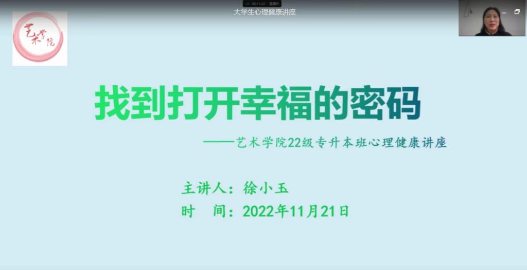 为加强封闭校园管理期间学生的思想政治教育工作力度,艺术学院坚持分级分类的开展大学生心理健康教育活动。11月21日上午,学院党委副书记徐小玉为2022级专升本班级同学70余人进行了积极心理建设专题讲座。