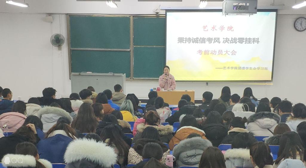 为加强学风建设,严肃考风考纪,帮助同学们养成诚实守信的良好品德,增强安全防范意识,12月27日中午艺术学院在8号楼合二教室举办“秉持诚信初心,决战零挂科”考前动员大会暨假期安全教育会,艺术学院正科级辅导员左玉含、2018级年级长、高年级优秀学生代表及2018级全体学生共300余人参加了本次大会。
