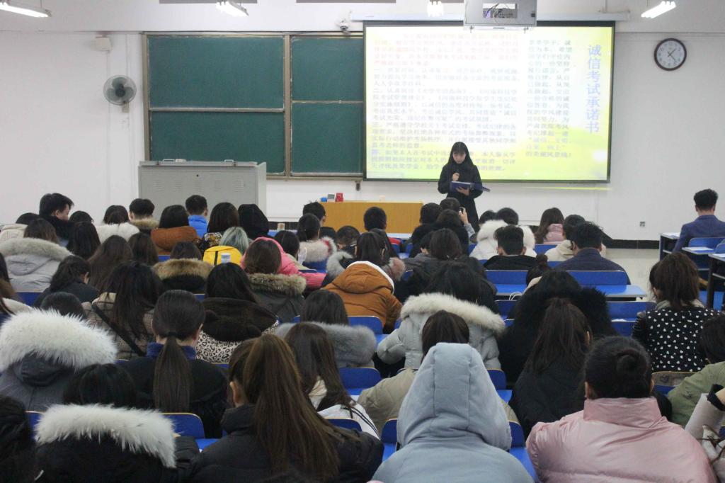 会上,左玉含老师鼓励2018级同学们认真复习,全力备战即将到来的期末考试,并强调了诚信考试的重要性。她指出考试是教学工作的重要环节,也是检测每一位学生对所学知识掌握情况的重要途径,良好的考风是优良校风、学风的重要体现,认真备考,严格遵守考试纪律是学生的基本行为规范,然后对《学生手册》中关于考试违纪处分的相关条款向大家做了说明。随后,左玉含老师还对即将到来的寒假假期从宿舍安全、假期外出务工、防传销和日常人身财产安全等方面结合实际案例给大家上了一堂安全教育课,提醒大家增强自我防范意识,杜绝安全隐患,防患于未然。接着,2018级年级长张嘉成和文曼鼓励大家以最佳状态迎接期末考试。在互动环节,美术171班温志珍、李芸燕两名优秀学生代表围绕应试的方法和技巧与同学们进行了经验分享和现场交流,并对大家提出的问题做相应的解答。最后2018级学生代表焦冰冰同学宣读《“秉持诚信初心,决战零挂科”诚信考试承诺书》,号召同学们认真复习、诚信应考。