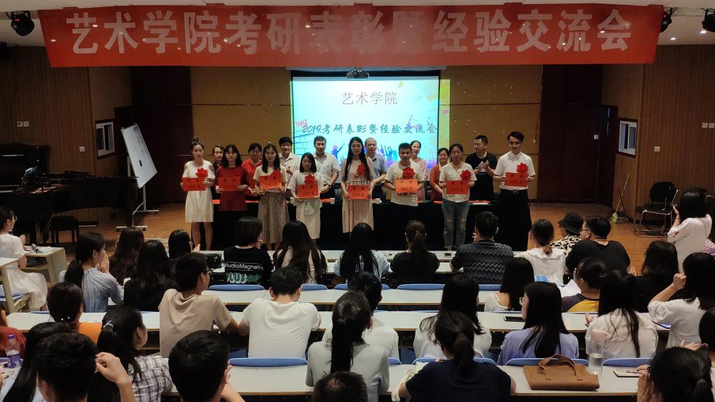 为了激发学生的学习热情和考研积极性,进一步夯实艺术学院的学风建设,引导大学生尽早树立正确的专业学习目标,5月31日,艺术学院在十一号楼合一音乐厅举办了2019年考研表彰暨经验交流大会,艺术学院党委书记张玉新、院长张新词、党委副书记徐小玉、副院长张思镜、设计系主任商亚敏、音乐系主任李娜、办公室主任郑世华、团委书记刘凤、2019届考取研究生学生代表及艺术学院有考研意向的学生近170余人参加了本次大会。