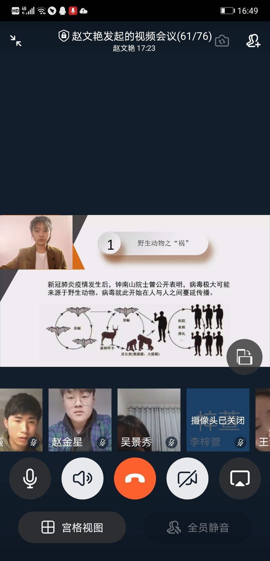 会上,全体学生党员共同认真学习了习近平总书记《生态文明建设是关系中华民族永续发展的根本大计》讲话,观看了《保护野生动物》、《病毒的传播》、《人类与大自然的关系》等一系列视频。随后,学生党员们通过视频连线开展话题微讨论,纷纷分享各自的感悟。张玲玲同学提出广大青年党员要提升思想认识、革除滥食陋习、积极参与打击行动、践行绿色生活,带动身边群众树立生态文明理念,推动形成文明健康、绿色环保的生活方式;马丽丽同学说到,面对这场突如其来的疫情,更加充分认识到了健康文明生活方式的重要性,作为青年党员要加强环保思想理念的学习和宣传,贯彻新发展理念,做文明健康、绿色环保生活方式的参与者、引领者。
