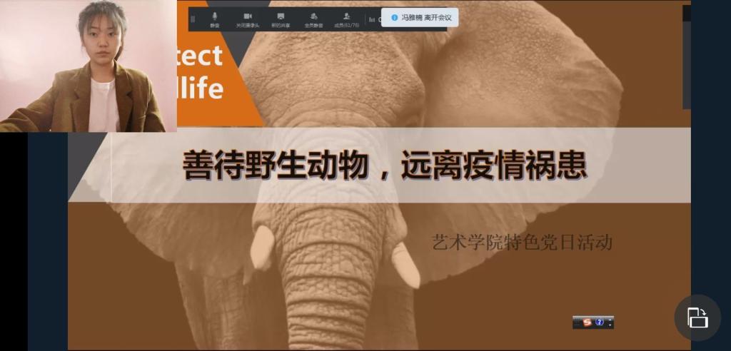 为进一步增强学生党员的凝聚力和保护野生动物意识,倡导健康文明的生活习惯,发挥学生党员的示范带头作用,推动形成文明健康、绿色环保的新风尚,4月10日,艺术学院各学生党支部,通过远程会议平台开展了“善待野生动物,远离疫情祸患”主题党日活动。会议由学生党员赵文艳主持,艺术学院全体学生党员参会。