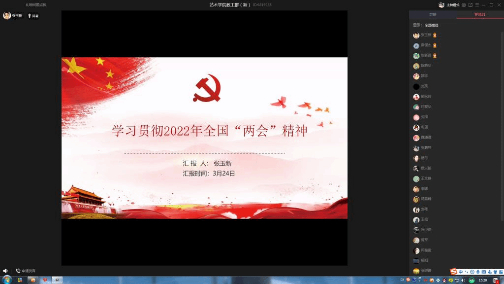 3月24日下午,艺术学院党委在线上召开专题会议,传达学习2022年全国“两会”精神,学院全体教师参加了此次会议。会议由学院党委书记张玉新主持。