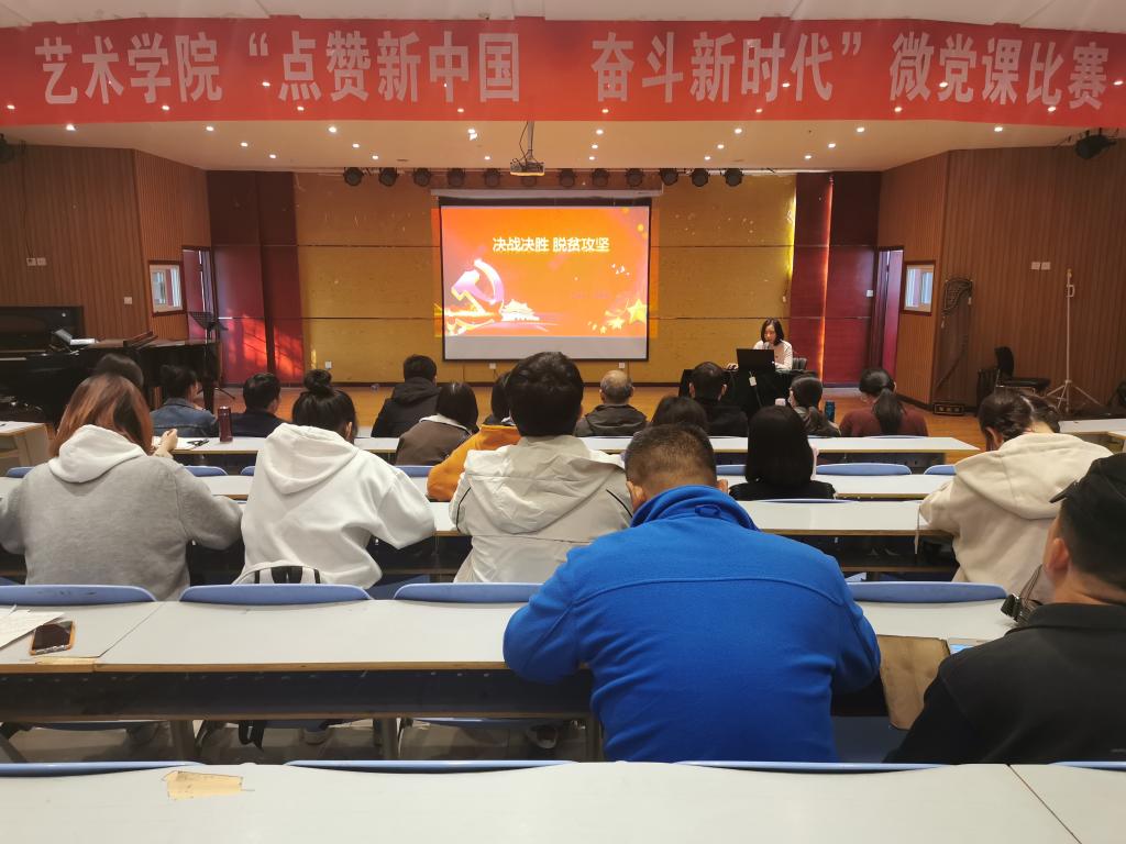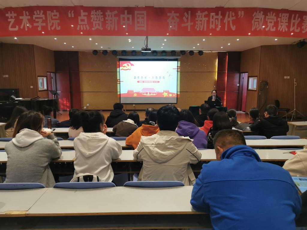 为深入学习贯彻习近平新时代中国特色社会主义思想,巩固拓展“不忘初心、牢记使命”主题教育成果,10月29日,艺术学院在十一号楼音乐厅举办“点赞新中国 奋斗新时代”微党课比赛,艺术学院党委书记张玉新、院长张新词、副院长雷保杰和艺术学院全体党支部书记担任评委,艺术学院师生党员共计100余人参加了本次活动。比赛由艺术学院团委书记刘凤主持。