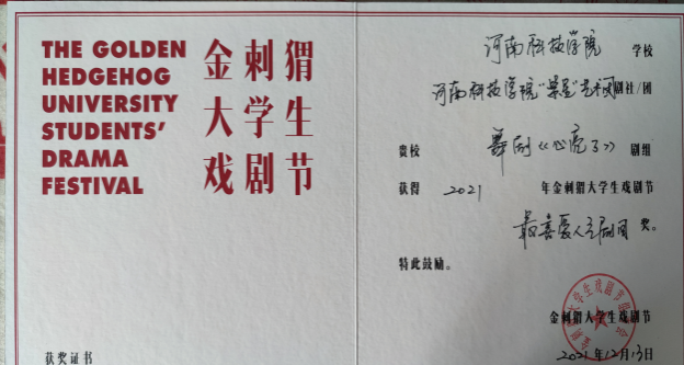 由北京市朝阳区文化和旅游局、北京戏剧家协会主办、北京市朝阳区文化馆、新京报社承办的2021金刺猬大学生戏剧节,经过评委会投票及组委会核定,在最终线上展演的10部作品中,我院原创舞剧《心亮了》荣获2021金刺猬大学生戏剧节优秀剧目奖、最佳演出奖、最佳表演奖、最喜爱人气剧目奖等多个奖项。