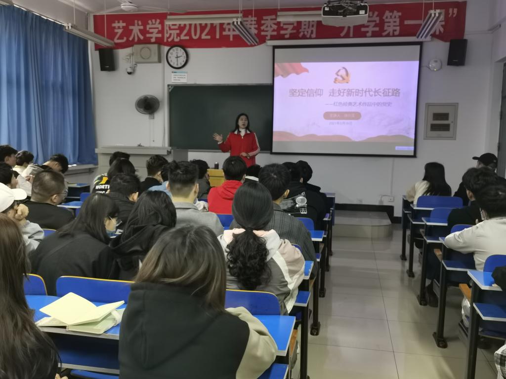 3月19日下午,艺术学院党委副书记徐小玉在9201教室给学生讲授专题的“开学第一课”。