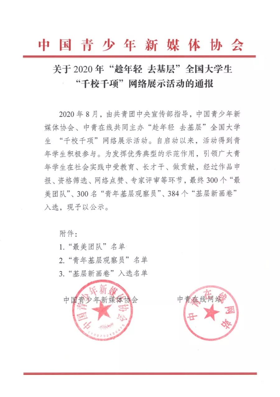 2020年8月,由共青团中央宣传部指导,中国青少年新媒体协会、中青在线共同主办了“趁年轻 去基层”全国大学生“千校千项”网络展示活动。为发挥典型的示范作用,引领广大青年学生在社会实践中受教育、长才干、做贡献,经过作品申报、资格筛查、网络点赞、专家评审等环节,最终300个“最美团队”、300名“青年基层观察员”、384个“基层新画卷”入选。