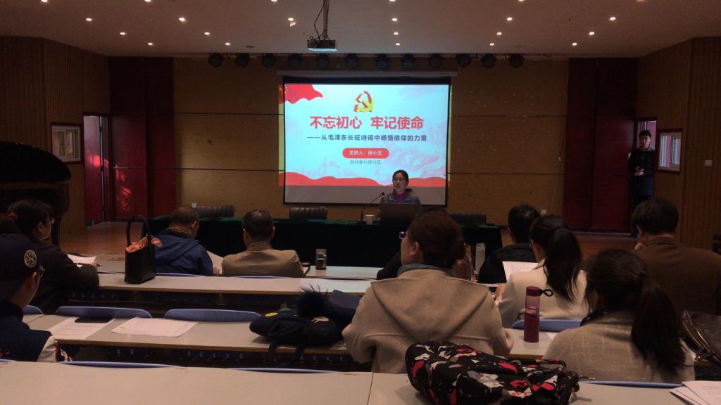 会上,艺术学院党委副书记徐小玉做了《不忘初心、牢记使命——从毛泽东长征诗词中感悟信仰的力量》专题讲座。徐小玉从毛泽东长征诗词的创作背景谈起,通过毛泽东长征诗词中充满革命乐观主义精神、充满“无我”的英雄主义和独特的艺术魅力这三个共性,讲到了毛泽东长征诗词中蕴含的共产党人救国救民的信仰的力量,这信仰的内涵就是为中国人民谋解放、谋幸福,这就是共产党人的初心和使命。