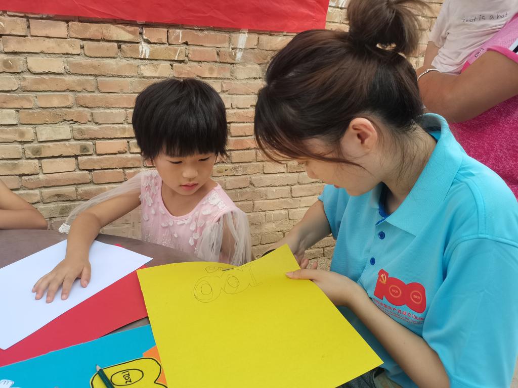 实践团师生们因地制宜,在村庄巷道、村民门口搭建课堂。课堂上,艺术学子们结合学院特点和专业特色,化身为一个个党的百年奋斗辉煌历史的讲解员,转变为用彩色画笔点缀爱党爱国画卷的教授者,从一艘小小的红船讲起,介绍党一路披荆斩棘的百年风雨历程,手把手教导孩子们画“五角星、红领巾、天安门”等标志性图案,耐心细致地教孩子们剪贴“庆祝建党100周年”的创意手工画。最后,孩子们在实践队员的指导下写出了对党的诚挚祝福。课程结束后,孩子们久久不肯离去,“我心向党,快乐成长”的呐喊声伴随着欢笑声在村子里荡漾。