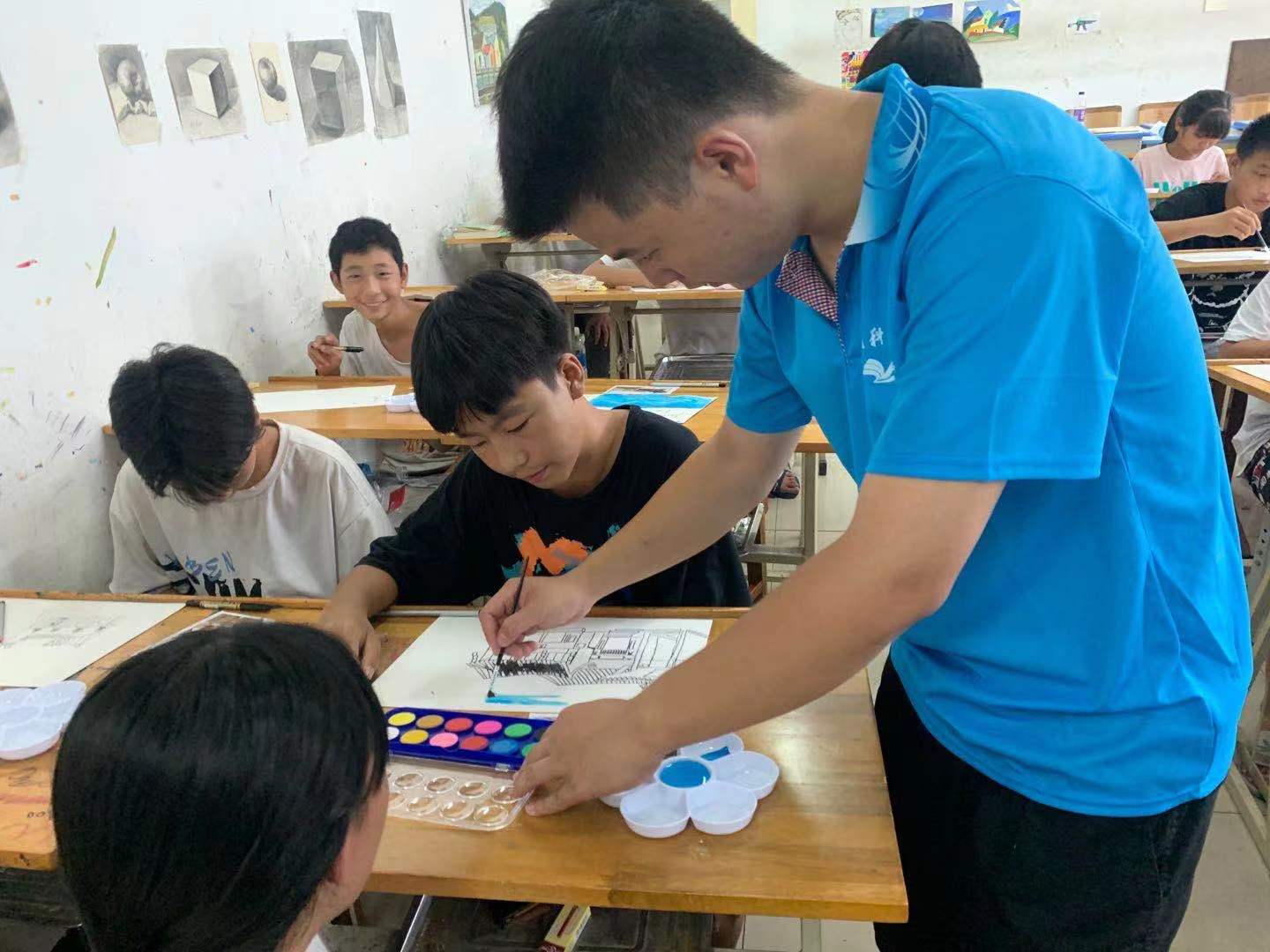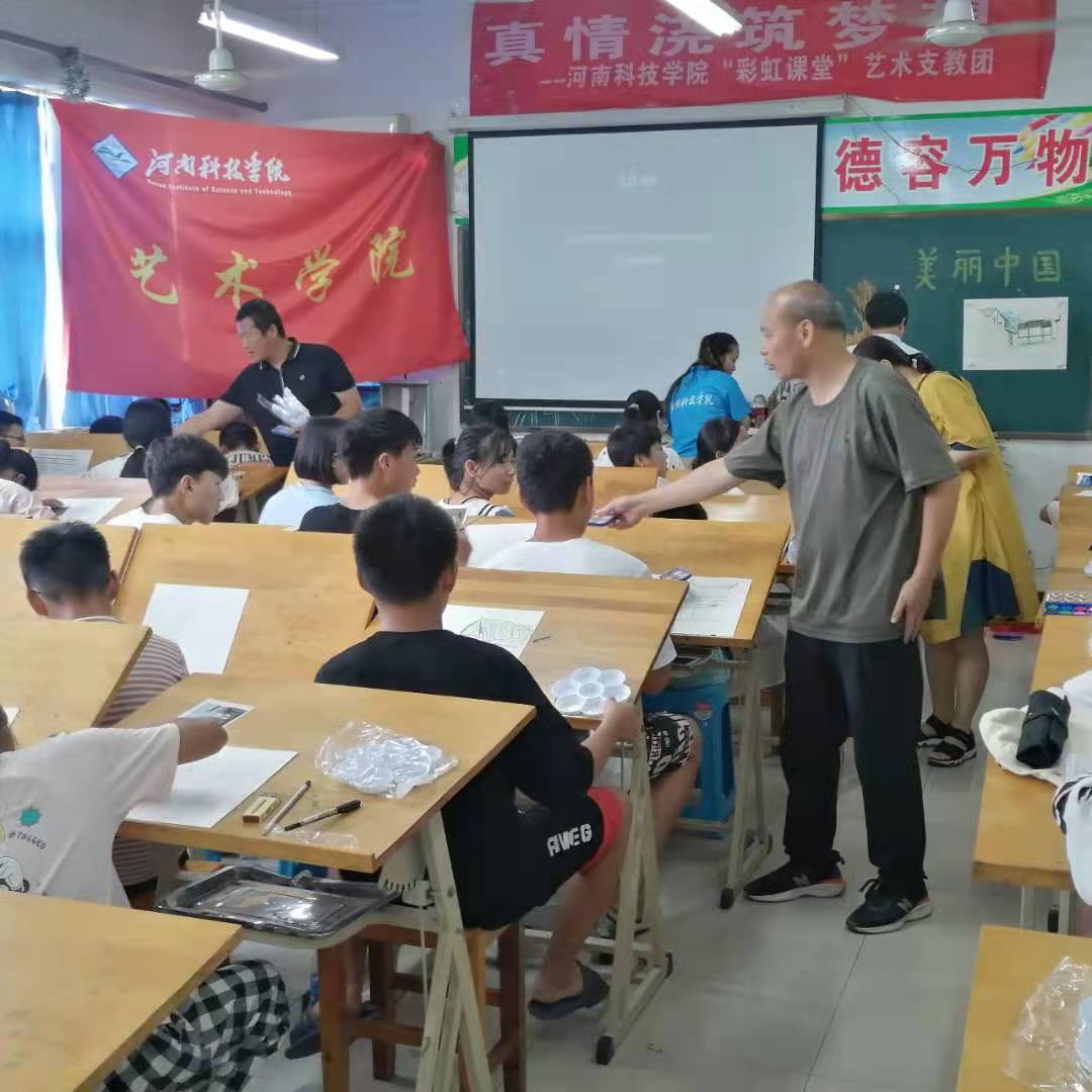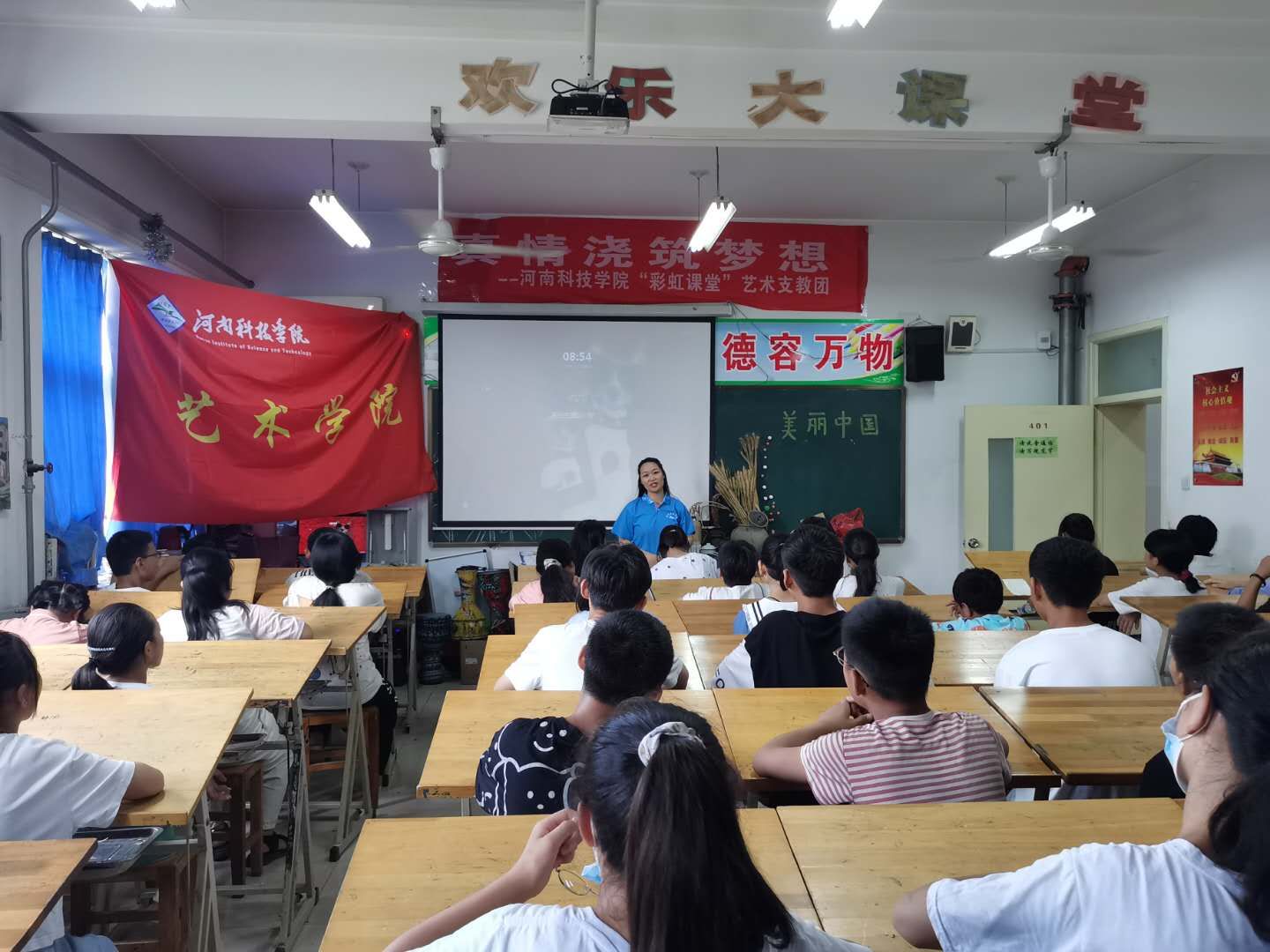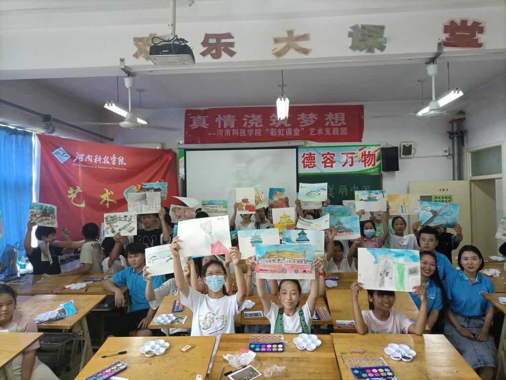 学院结合学生实际,对“彩虹课堂”艺术支教活动工作进行周密安排部署,制定《“同舟共济、共御洪灾”河南科技学院转移安置点“彩虹课堂”课程教学活动方案》,统筹安排每节课的主讲教师和学生助教,精心准备上课教具,做好学生课前课后的安全接送等工作。8月1日,艺术学院“彩虹课堂”艺术支教团在河南科技学院子弟小学正式开班。第一讲由艺术学院郝好燕老师开讲,郝老师以《美丽中国——色彩风景》为题进行授课。课上,郝老师通过对色彩风景画的发展与演变历程的讲解、示范绘画方法与步骤、小组协作等教学环节,让学生用画笔描绘出祖国的美丽风光,在视觉的冲击中感受祖国的壮美山河和历史古镇,从而增强孩子们发现美、创造美的能力,抚慰学生心灵。