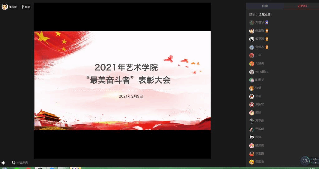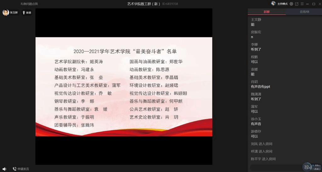 在热烈庆祝第37个教师节之际,为树立典型,鼓励先进,促进工作,9月9日,艺术学院在QQ课堂召开第三届“最美奋斗者”表彰大会,艺术学院党政领导、全体教工参加了大会。