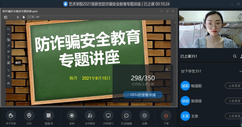 9月15日上午10:00—10:30,由21级新生辅导员杨丹老师在钉钉上进行防诈骗安全教育专题讲座,通过揭露不同类型诈骗案例背后的本质,指导学生如何识破骗局,帮助学生提高防诈骗意识。最后,杨老师提醒同学们守好个人信息和验证码的最后底线,与父母、亲朋好友多交流,防范诈骗从身边做起,传递好每一份正能量,弘扬时代主旋律。