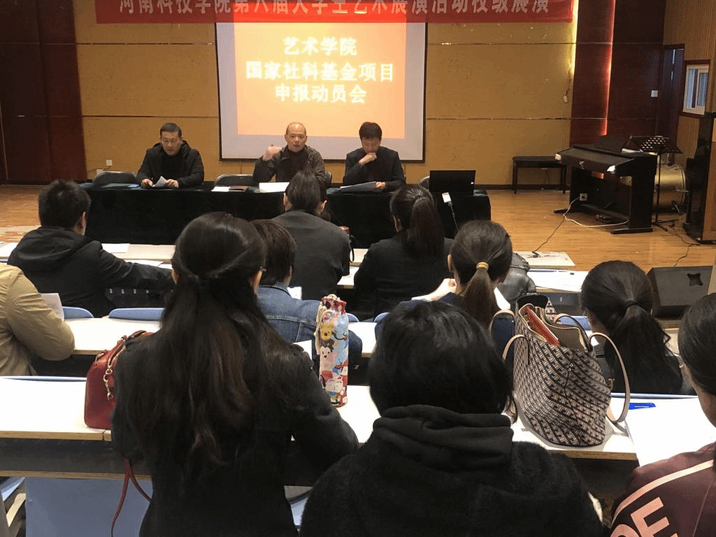 10月22日下午,艺术学院在11号楼合一召开了国家社科基金项目申报动员会。学院相关党政领导、博士、副高级职称教师,教研室负责人等参加了会议。张新词院长围绕学校制订的2021年度国家社科基金申报方案,详细分析申报的阶段进程,并结合我院的实际情况布置具体工作。他分析了高级别重大项目及项目成果对我校艺术专业学科建设的意义。鼓励动员骨干教师建立研究团队积极参与项目申报,鼓励有前期研究基础的教师尤其是在研或者结项省级项目的教师整合前期资料并积极参与申报工作,同时还强调了学院对项目申报支持、扶持的措施,会后老师们展开了积极的交流合讨论。
