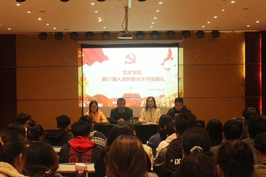 10月15日晚,艺术学院在11#音乐厅举行第五十一期入党积极分子培训班开班典礼。学院党委书记张玉新为入党积极分子做开班第一讲:《党旗下的青春》。