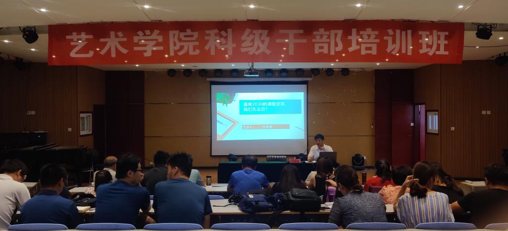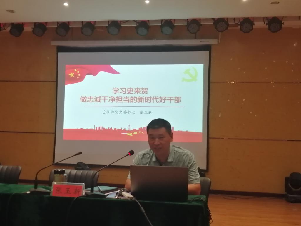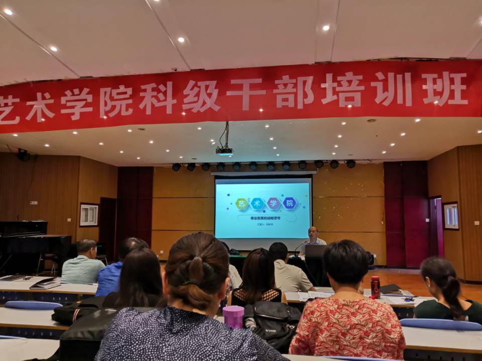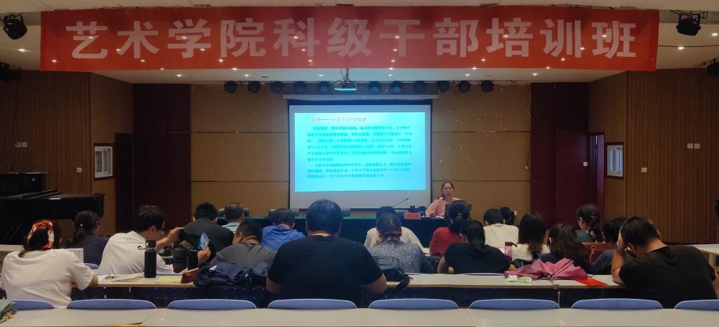 在专题讲座环节,艺术学院党委书记张玉新作了《学习史来贺—做忠诚干净担当的新时代好干部》。张书记从史来贺的生平成就、史来贺精神的内涵和时代价值入手,引导广大科级干部积极学习史来贺,做新时代的好干部,像史来贺一样,始终心中有党,做政治上的明白人,心中有民,做群众心中的贴心人,心中有责,做发展上的开路人,心中有戒,做作风上的带头人;艺术学院院长张新词作了《艺术学院发展战略思考》专题讲座。张院长从艺术学院的概况、事业快速发展的负效能、发展的困境和机遇、事业发展的战略思考、干部该如何担当几个方面进行了讲解,要求广大干部以先进的党建思想和教育理念为引导,聚焦主业,凝心聚力,深化教育教学改革,为推动艺术学院事业的全面发展积极做出贡献;艺术学院党委副书记徐小玉和副院长张思镜也分别做了《用爱心导航,做学生成长的知心朋友》和《面向2030的课程改革,我们怎么办?》的专题讲座。