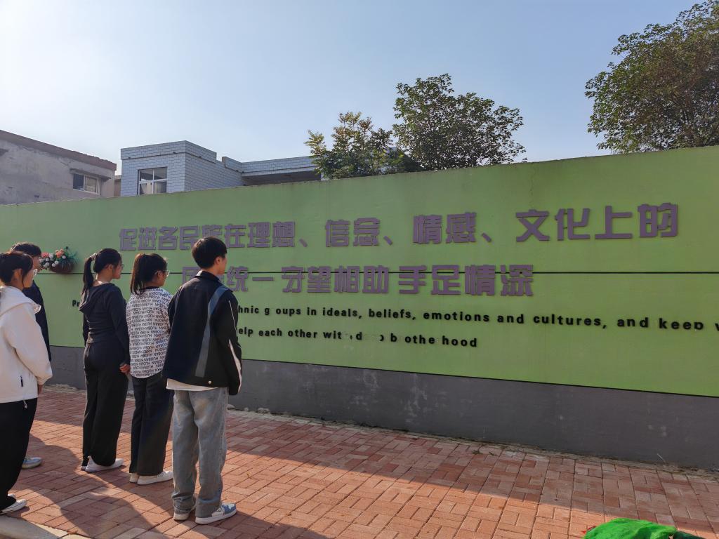 近年来,殷庄村大力开展铸牢中华民族共同体意识主题游园创建工作,建成以民族团结为主题的“多彩石榴街”。村党支部书记孙红昌带领大家参观了民族长廊、同心亭等内容,声情并茂地讲述了在新疆工作时与锡伯族、哈萨克族、维吾尔族等少数民族群众团结奋斗的温暖经历,深入浅出地为我校师生阐释了铸牢中华民族共同体意识的重要性和必要性。