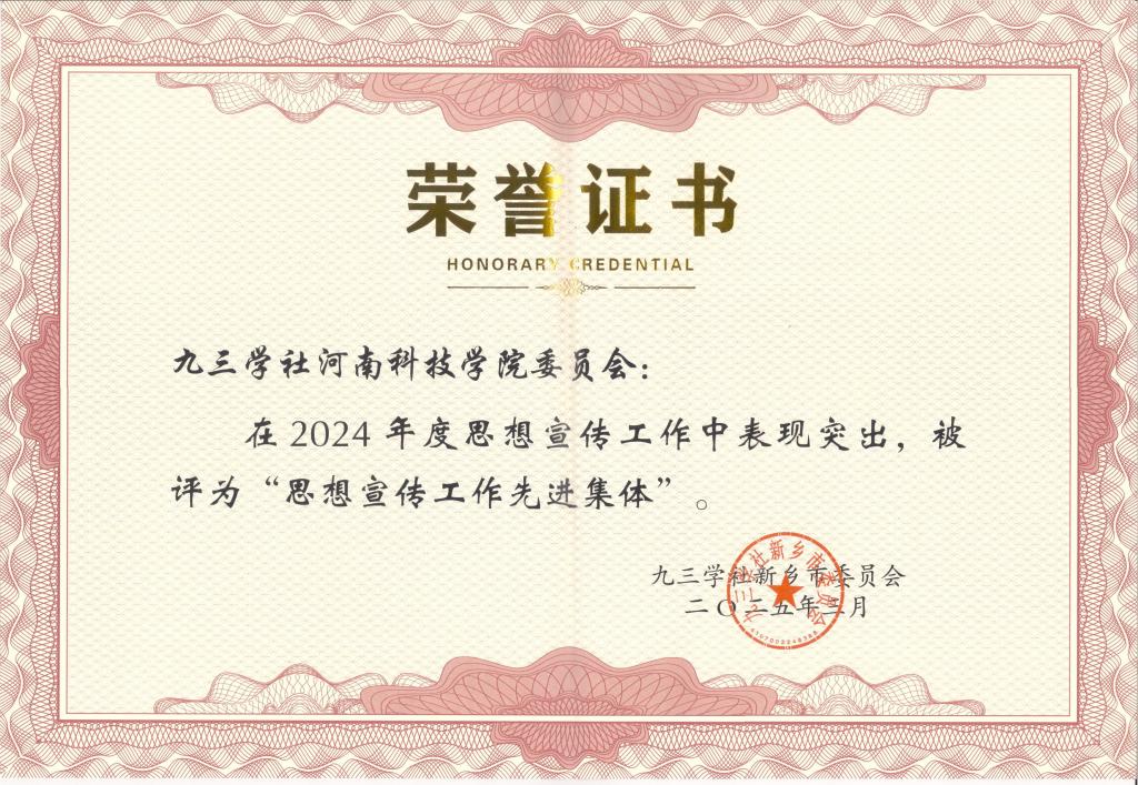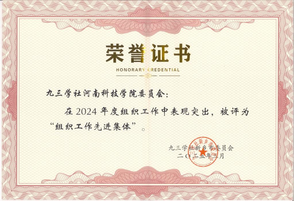 2024年,九三学社河南科技学院委员会在校党委的正确领导下,加强基层组织建设,鼓励社员立足本职岗位,发挥专业优势,积极参与社会服务,建言资政成果丰硕,姚素梅撰写的《关于加强我省道地药材优良品种选育与标准化种植的建议》、韩其晟撰写的《加快水利设施升级改造,优化区域水资源管理》、周凯和贺栋撰写的《关于增加电动自行车停车位设计防火规范的建议》被新乡市政协、九三学社河南省委员会采用;周凯撰写的《推动产学研用深度融合 加快我省科技成果转化应用》、周凯和贺栋撰写的《加快我省农业“降碳”步伐 推进人与自然和谐共生》被采用为河南省政协常委会书面发言材料。