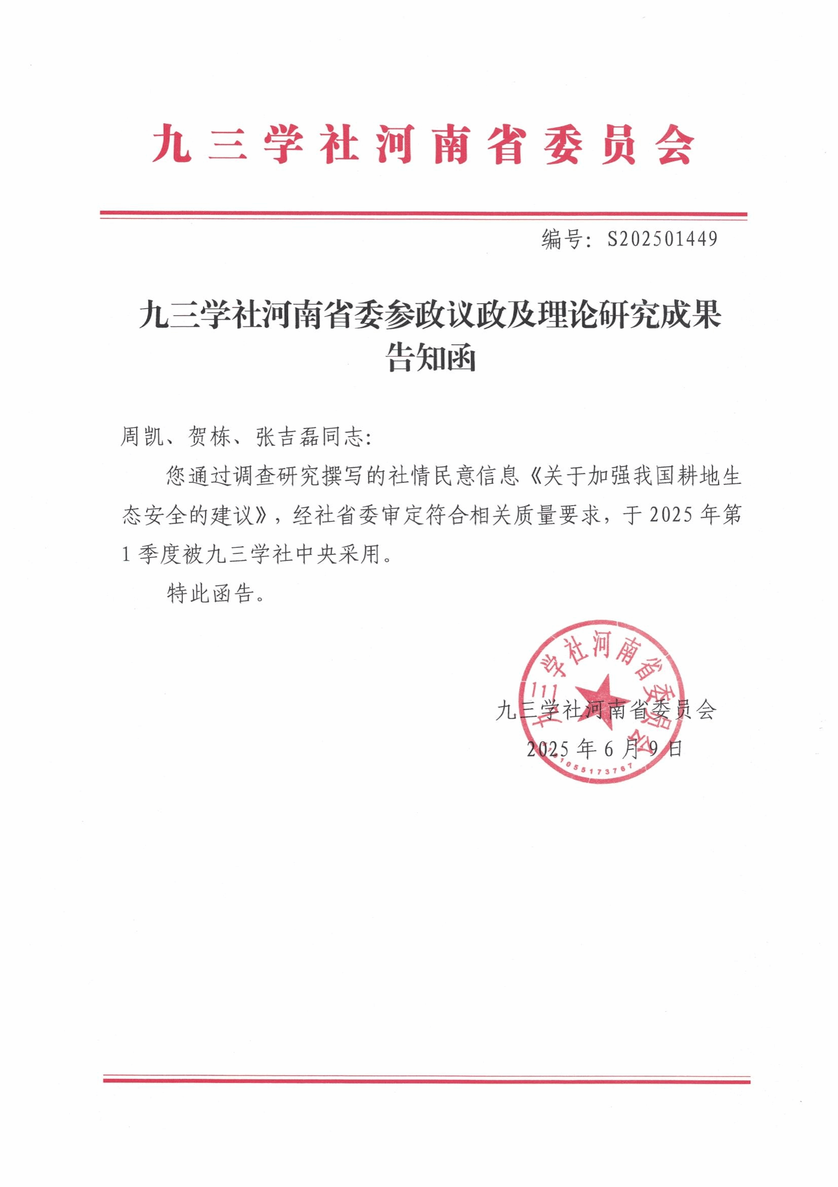 近日,九三学社新乡市委会召开参政议政工作推进会,对上半年的参政议政工作进行了总结。我校九三学社委员会副主委、园艺园林学院周凯副教授和贺栋老师等撰写的社情民意信息《关于加强我国耕地生态安全的建议》被九三学社中央采用。我校九三学社委员会主委、农学院副院长姚素梅教授撰写的《促进新型农村集体经济发展 健全基层高效能治理体系》课题成果被河南省政协十三届十四次常委会书面发言采用。