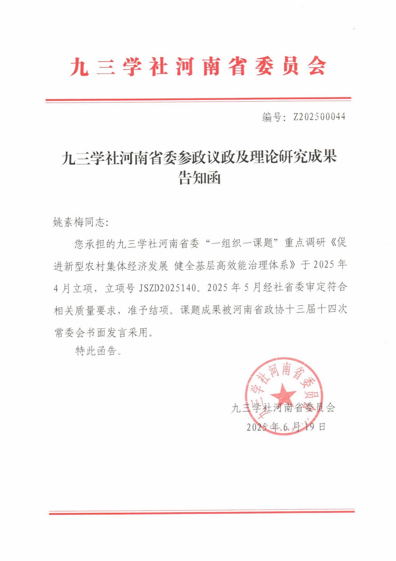 近年来我校九三学社委员会积极围绕国家战略需求,主动融入国家创新布局,积极发挥九三学社科技界别优势,为区域发展建真言,为经济建设献良策,参政议政成果丰硕,彰显了我校九三学社社员助力发展、服务社会的责任与担当。