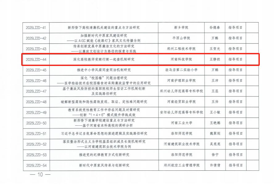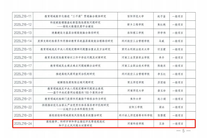 近日,河南省纪委监委驻省教育厅纪检监察组印发了《关于2025年度河南省教育系统廉政专题研究项目立项通知》(豫驻教纪监发〔2025〕8号),我校两名教师主持的课题成功获批立项。