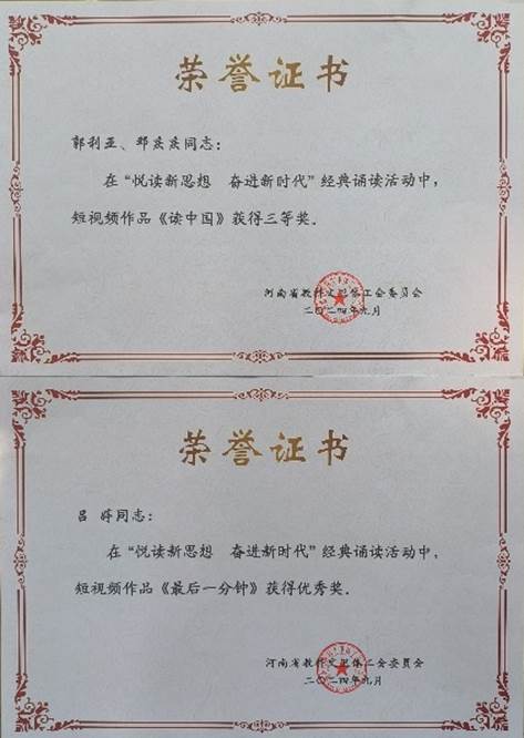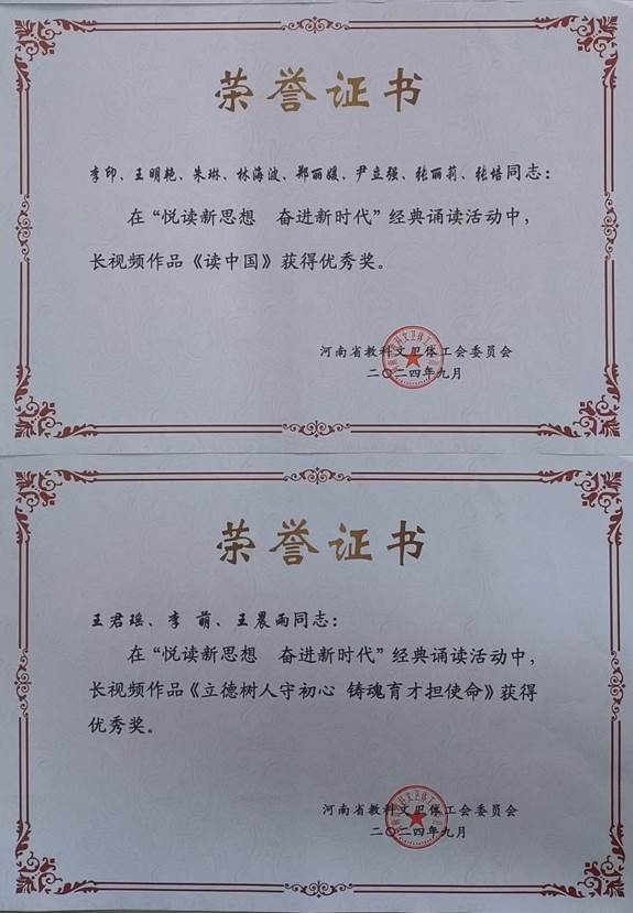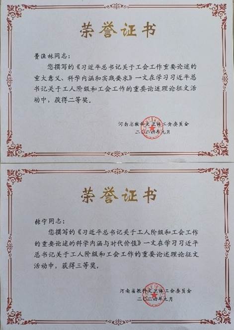 我校工会选送的诵读作品《以青春的名义犒赏每一颗奋斗的中国心》获长视频作品二等奖,《读中国》获短视频作品三等奖,其余三个作品获得优秀奖。征文作品《习近平总书记关于工会工作重要论述的重大意义、科学内涵和实践要求》获二等奖,《习近平总书记关于工人阶级和工会工作的重要论述的科学内涵与时代价值》获三等奖。