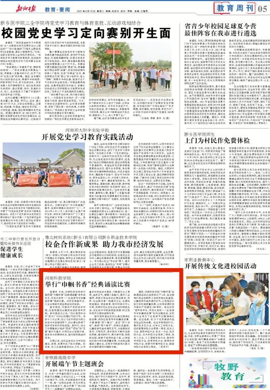 为庆祝中国共产党建党100周年,近日,我校举行了第四届“巾帼书香”经典诵读暨“家声百年长、风范永流传--红色家书中的廉洁故事”朗诵比赛。6月16日,《新乡日报》第五版教育周刊对此进行了详细报道。报道如下: