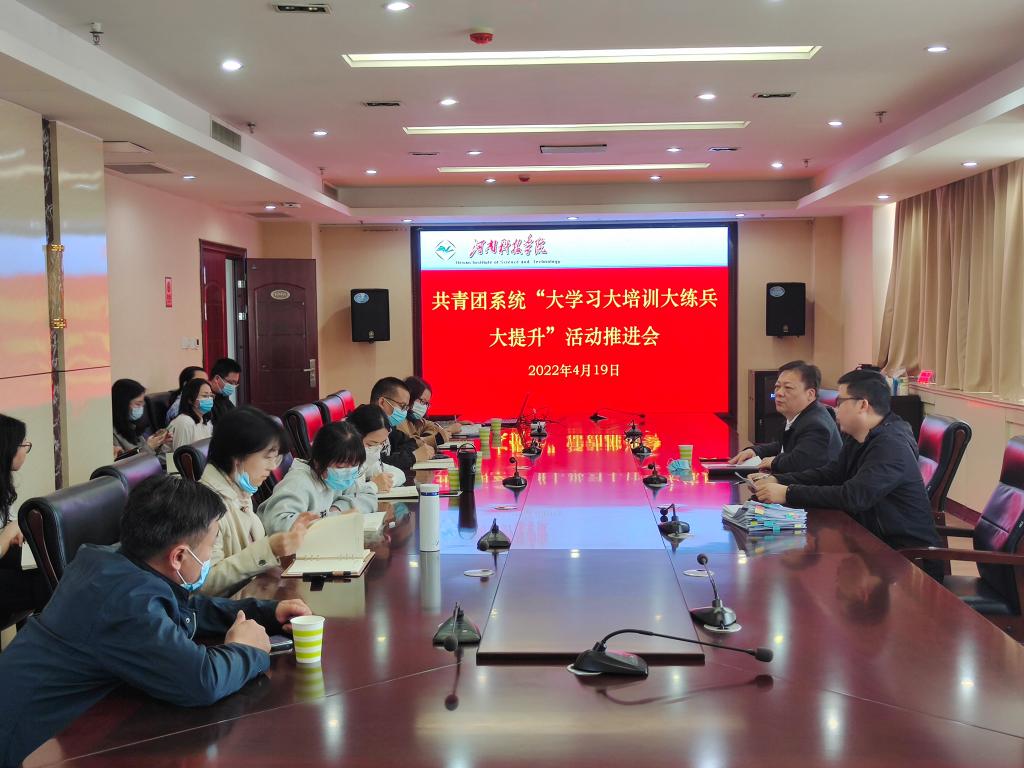 4月19日下午,我校共青团系统“大学习大培训大练兵大提升”活动推进会在行政楼901会议室召开,校团委和二级学院团干代表参加了会议。