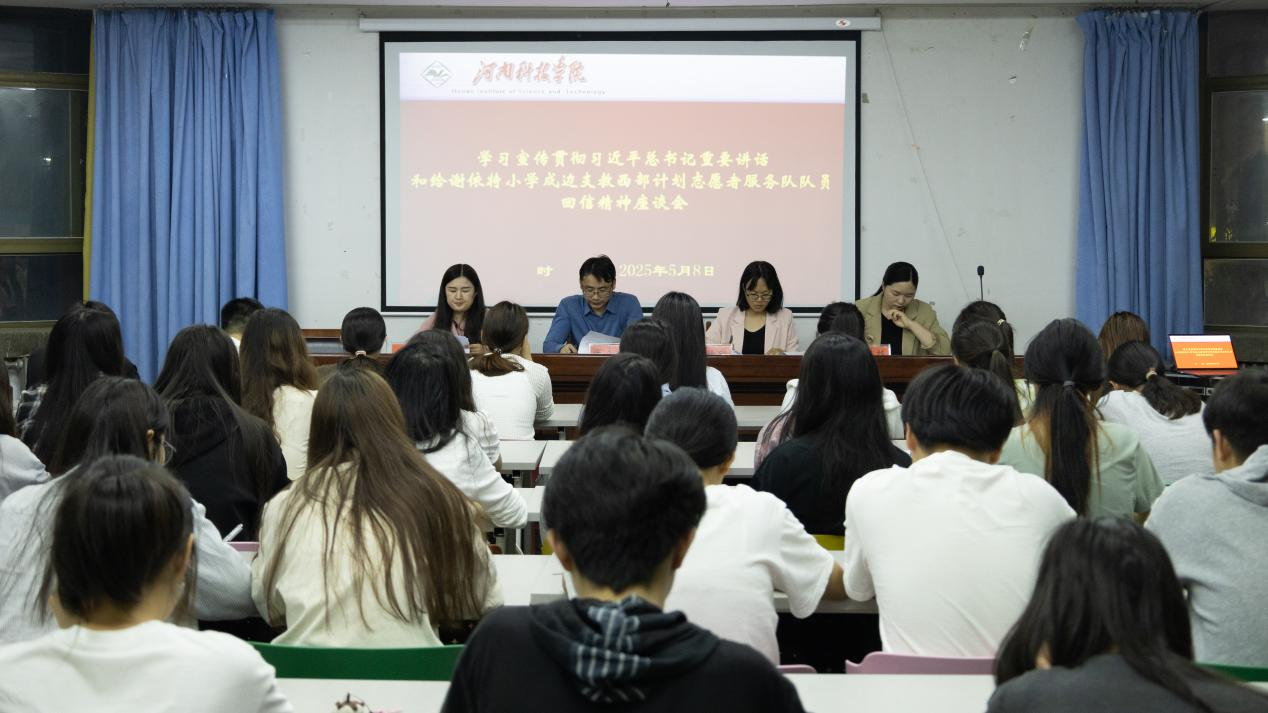 5月8日晚,校团委在实验楼A200会议室召开学习宣传贯彻习近平总书记重要讲话和给谢依特小学戍边支教西部计划志愿者服务队队员回信精神座谈会,校团委书记张永波、副书记马婧丽及部分团委负责老师、学生代表等70余人参加了座谈会。