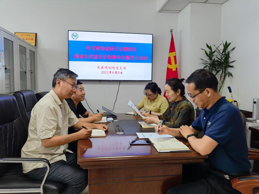 6月8日,发展规划处党支部在行政楼510室开展学习贯彻省委书记楼阳生、副省长武国定讲话精神主题党日活动。支部全体成员参加会议,九三学社社员郭运瑞处长列席会议。
