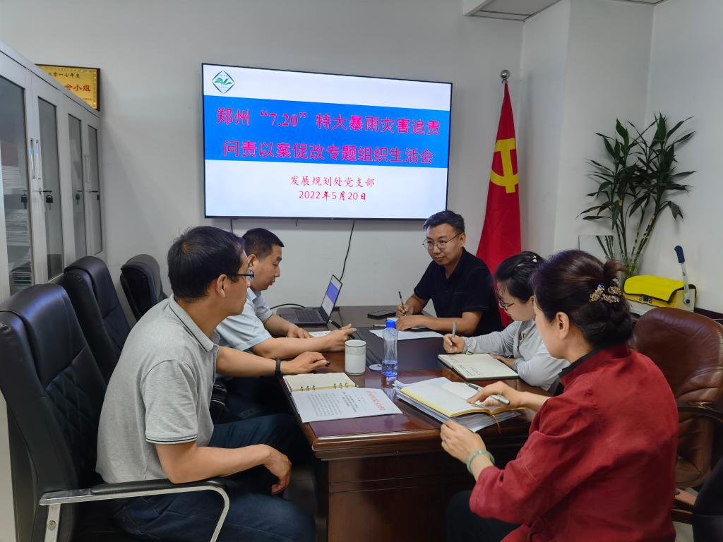 5月20日,发展规划处党支部在行政楼510室召开郑州“7.20”特大暴雨灾害追责问责以案促改专题组织生活会。支部全体成员参加会议,处长郭运瑞列席会议。
