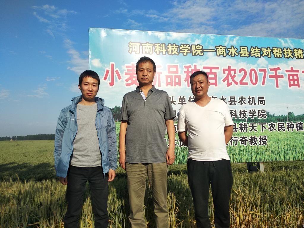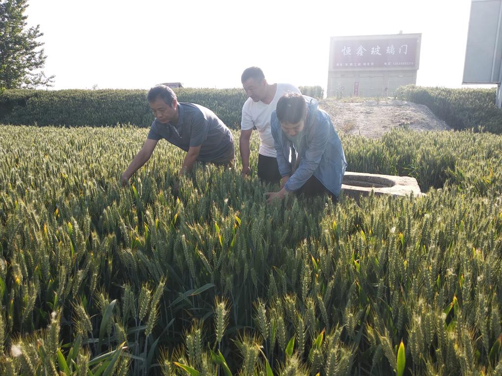 在谭庄镇耕天下农民种植合作社,吴大付教授和唐蛟博士现场查看了河南科技学院与商水县结对帮扶精准扶贫项目建设的百农207小麦千亩方项目,对小麦生长后期水肥供应和灌浆期病虫害管理进行了专业指导。