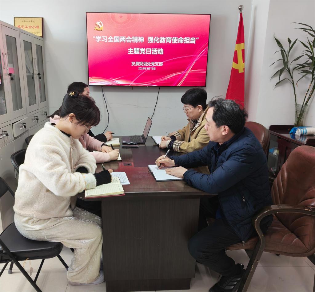为深入学习贯彻全国两会精神,3月19日下午,发展规划处党支部召开党员大会,开展“学习全国两会精神 强化教育使命担当”主题党日活动。会议由支部书记赵颖主持。