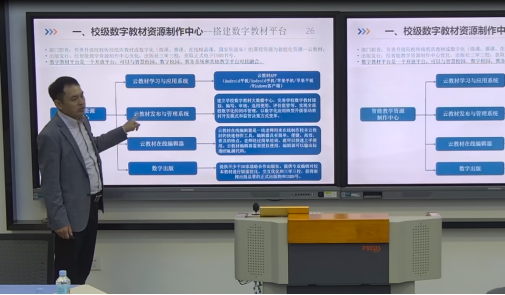 蔡葆峰老师作了题为《新形态数字教材建设助力“四新”专业重塑升级》的专题报告。他解析了教材迭代升级的发展历程,着重介绍了“数字化、智能化”新形态教材服务平台的建设情况,对“四新”背景下新形态教材建设项目的有关政策文件进行了解读。结合具体的数字化教材建设案例,蔡葆峰老师进行了教材编写步骤的现场演示,为教师们提供了编写方面的方案和方法指导。
