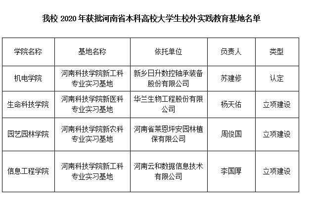 近日,河南省教育厅公布了河南省本科高校大学生校外实践教育基地名单,我校机电学院申报的新工科专业实习基地被直接认定为河南省本科高校大学生校外实践教育基地,此外,生命科技学院、园艺园林学院、信息工程学院等申报的3个实习基地获批立项建设。