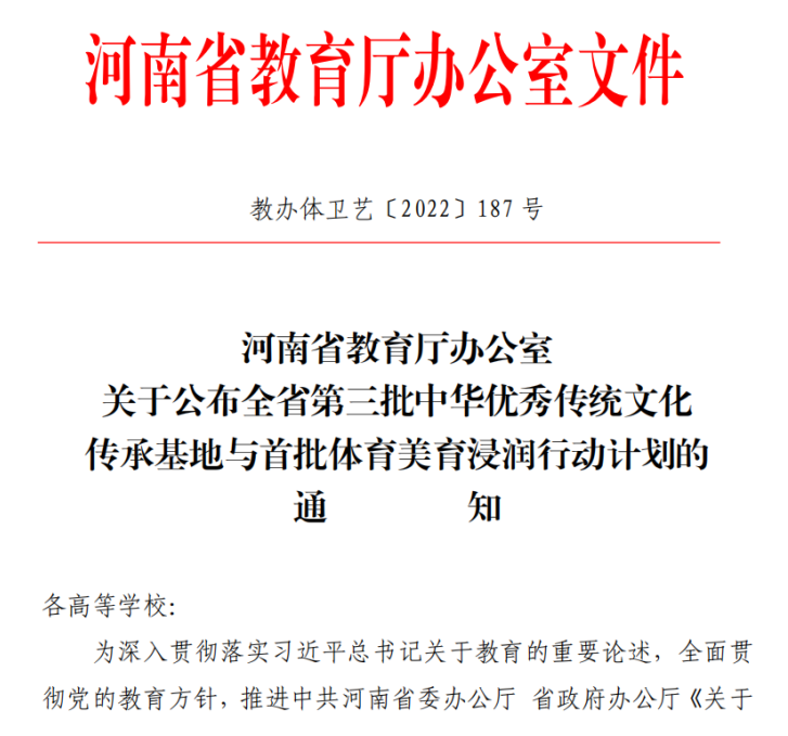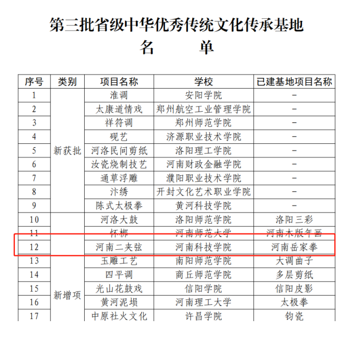 我校获批“河南岳家拳”和“河南二夹弦”两个中华优秀传统文化传承基地。这将有利于进一步推进中华优秀传统文化全方位融入学校教育,对提高我省高校优秀传统文化的创新、传承和发展发挥着辐射带动作用。