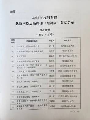 近日,河南省社会科学界联合会公布了2022年度河南省优质网络思政微课(微视频)获奖名单,我校马克思主义学院4位教师在此次活动中获得佳绩。其中,张雪霞老师的《共同富裕是社会主义的本质要求》获思政微课一等奖第二名、王欣欣老师的《“勤学”,“修德”,“明辨”,“笃实”--践行社会主义核心价值观》、侯瑶瑶老师的《文艺新气象文化新辉煌--从河南卫视“中秋奇妙游”看文化自信》;胡腾允老师的《实现中华民族伟大复兴--中国近现代史的主题》获思政微课二等奖。