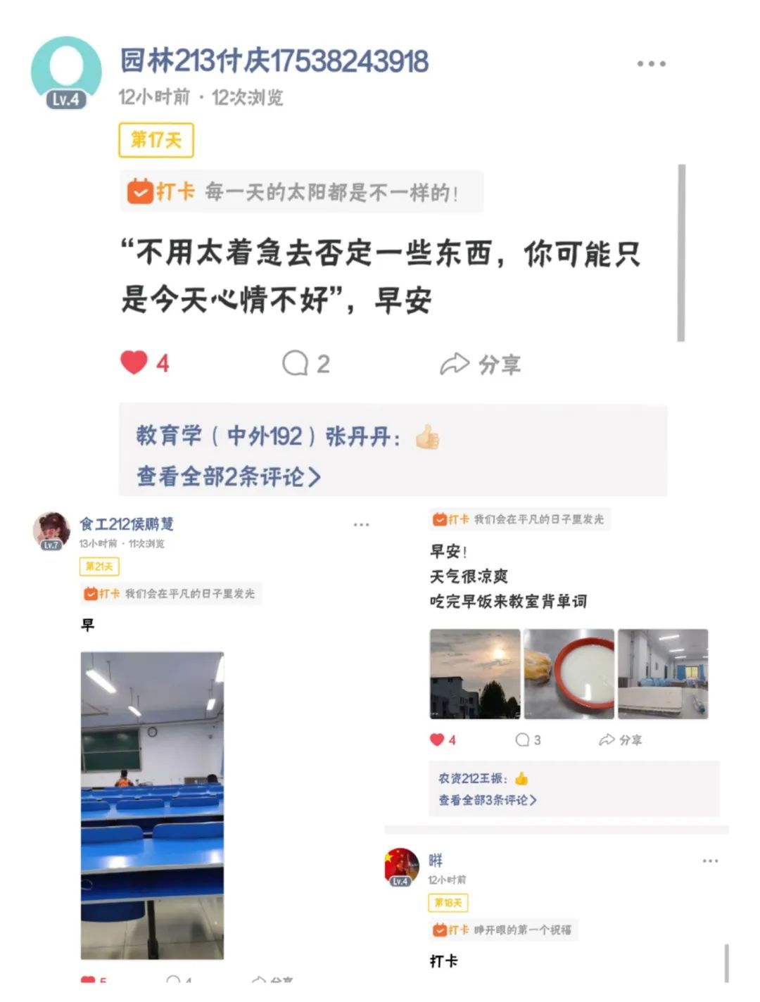 活动开展以来,累计参与人数为5000余人,发表了38000余条动态。同学们从最开始需要提醒,到后来的每日积极打卡,甚至本次活动结束之后,有些同学仍在积极打卡,大家早已形成了一种习惯。晨起阅读,于书中点缀昨日旧梦;与单词较量,每一天坚持的背后,是不灭的进取之心;即刻出发强身健体,没什么能够阻挡我的步伐;每日早起,用朝霞迎接美好的一天;分享美食,疗愈心情、治愈万物;携春色的浪漫邂逅校园的美景。