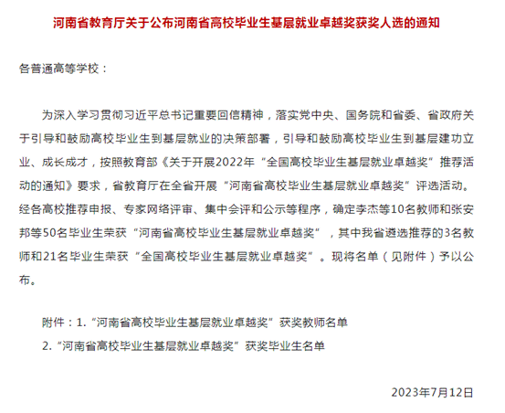 此次评选活动旨在深入学习贯彻习近平总书记重要回信精神,落实党中央、国务院关于引导和鼓励高校毕业生到基层就业的决策部署,引导和鼓励高校毕业生到基层建功立业、成长成才。经高校推荐、专家评审、集中会评等程序,最终评选出“河南省普通高校毕业生基层就业卓越奖”高校毕业生50人。