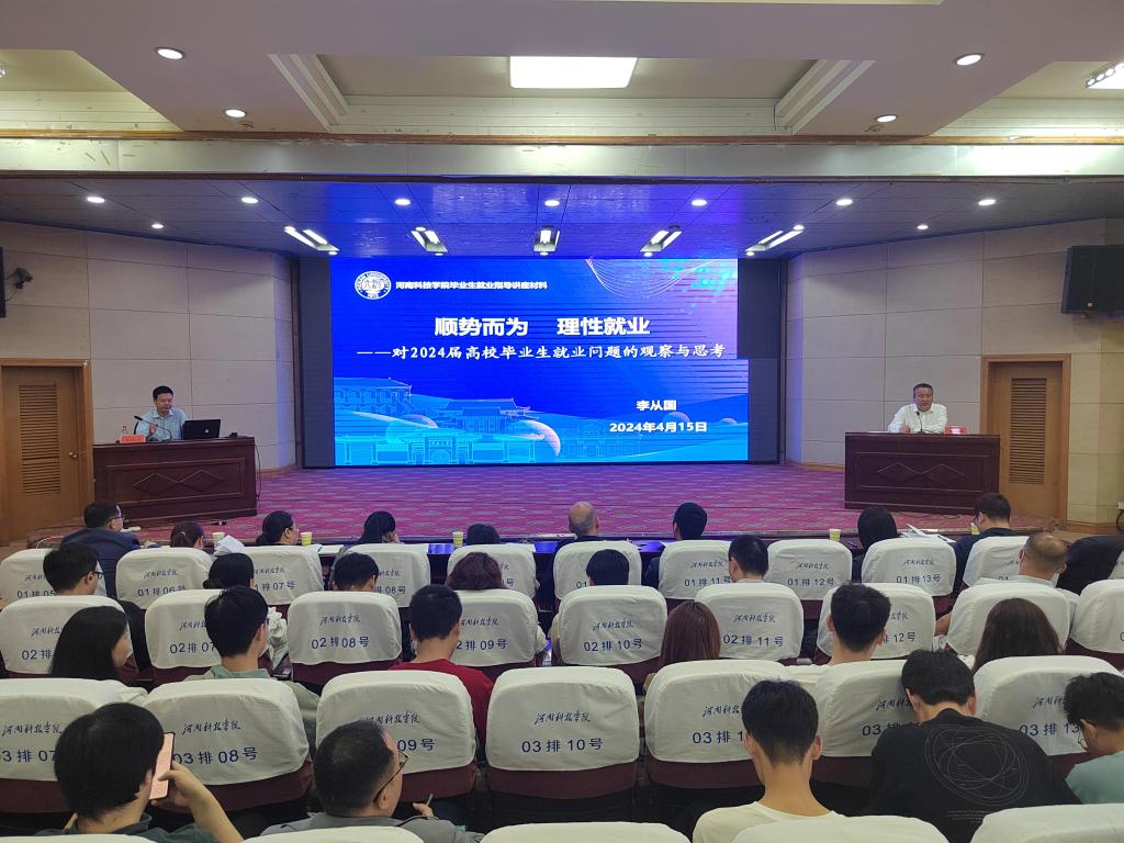 为提升我校就业创业教师授课能力,促进学校就业创业课程体系建设,推动2024届毕业生高质量充分就业,4月15日下午,我校邀请河南大学就业创业指导中心主任、创新创业学院院长李从国教授作题为“顺势而为、理性就业--对2024届高校毕业生就业问题的观察与思考”和“用心用情用力指导和服务毕业生顺势而为理性就业--对高校开展就业工作的一些实践和思考”的专题报告。学生处、就业创业指导中心、各学院党委副书记、毕业生辅导员、职业规划与就业创业教研室教师和各学院2024届毕业生代表参加了讲座。学生处处长、就业创业指导中心主任冀红举主持讲座。