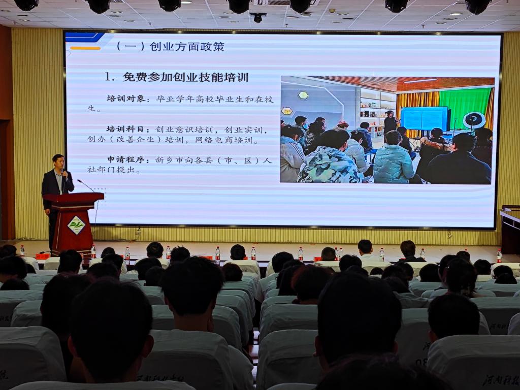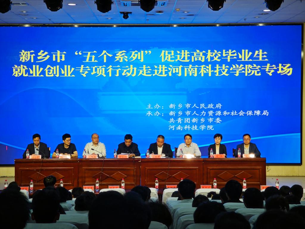 4月28日,由新乡市人民政府主办,新乡市人力资源和社会保障局、共青团新乡市委和我校共同承办的新乡市“五个系列”促进高校毕业生就业创业专项行动在图书馆一楼报告厅举行。新乡市人力资源和社会保障局党组成员、副局长时水利,共青团新乡市委副书记史跃东,青年创业工作科科长左统领,市人社局就业办主任刘小彭,校学生处处长、就业创业指导中心主任冀红举、校团委书记张永波、食品学院党委书记陈腾、就业创业指导中心副主任李月涛以及200余名师生代表参加了此次会议。会议由刘小彭主持。
