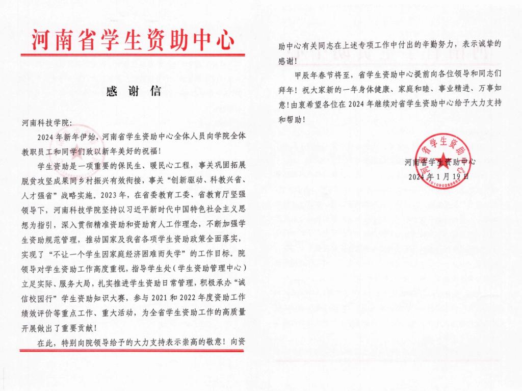 近日,省学生资助中心给我校发来感谢信,对我校的学生资助工作给予表扬,向校领导对资助工作的高度重视和大力支持表示感谢,并为全校教职工和同学们送上新年祝福。
