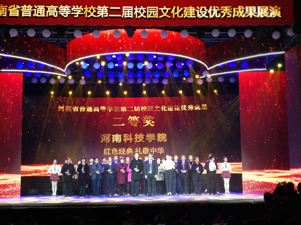 12月4日至5日,由中共河南省委高校工委、河南省教育厅主办,河南大学承办的河南省第二届普通高等学校校园文化建设优秀成果展演暨颁奖典礼在河南大学举行,我校推荐的《红色经典礼敬中华》(艺术学院)荣获了河南省校园文化建设优秀成果二等奖,并参加了本次展演活动。副校长王霞出席颁奖典礼,学生处、艺术学院相关负责人参加了会议。