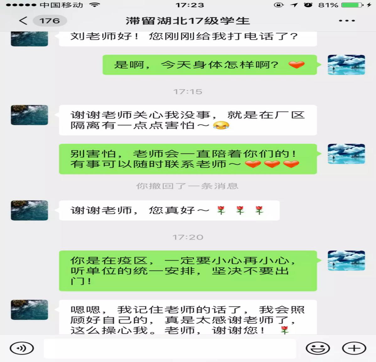 “李老师,谢谢您和我聊了这么多,感觉现在啥都没有疫情防控、保护好自己重要,我听您的话,就呆在这里不回家了。”当生命科技学院辅导员李沐老师挂掉电话后才发现,时间在不知不觉中已经过去了77分钟。电话的另一端是2018级一位在省外打工的学生,打工过程中遇到了不顺心的事,声称即便自己没有口罩也要坚持回家,李沐老师通过电话耐心劝导、谈心谈话70多分钟,问题得以圆满解决,学生表示要听从学校和老师的要求,保护好自己,暂不返乡,此时一颗悬着的心终于放下。事后李沐老师说,刚开始学生的情绪很不好,我都快急哭了......
