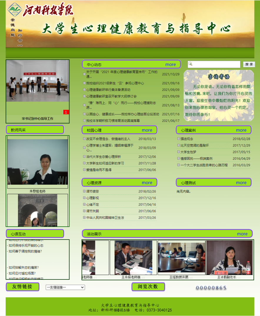 心理中心网址:http://xlzxzx.hist.edu.cn/,开设有中心动态、校园心理、心理案例、心理资源、心理测试和心理互动等栏目,将发布有关心理健康、心理调节的相关内容,以更好的服务广大师生,敬请关注。