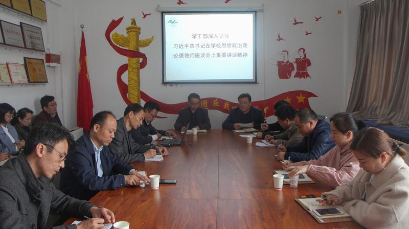 校团委书记于江傲领学了习近平总书记在学校思想政治理论课教师座谈会上的重要讲话精神。从思想政治教育的根本任务、对思想政治教育工作者六个方面的要求、思想政治教育改革创新八个“相统一”、以及加强制度保障等方面进行了深刻解读。学工部部长、学生处处长翟居怀要求广大学工干部要带头学习讲话精神,抓好思想政治教育的改革和创新,严格落实六项要求,将讲话精神在学生日常教育与管理中落到实处。