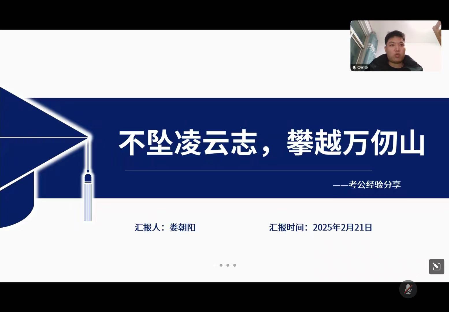 娄朝阳以《不坠凌云志,攀越万仞山》为题,结合自身备考及基层工作经历,进行了深入且全面的分享。他从明确考试方向与信息收集讲起,阐述了科学制定备考计划的重要性,分享了行测高效提分技巧和申论突破关键点。在谈到面试备考时,着重从语言表达流畅,逻辑思路严谨,肢体语言和面部表情自信大方等方面强调了面试逆袭的策略。最后,在交流互动环节,同学们积极提问,娄朝阳逐一答疑解惑,并鼓励同学们:要始终保持积极向上的心态,相信努力终有回报。