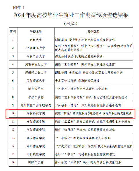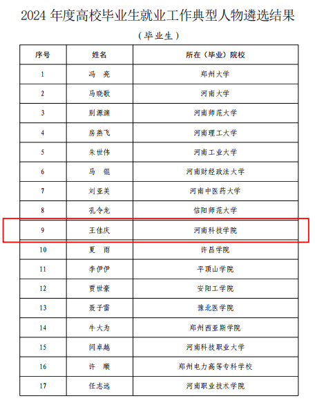 近日,河南省教育厅办公室公布《关于公布2024年度高校毕业生就业工作典型案例遴选结果的通知》(教办学〔2025〕134号),我校《构建“四化”精准就业指导服务体系 促进毕业生高质量就业》入选典型经验(校级),2023届电子科学与技术专业毕业生王佳庆入选典型人物(毕业生)。