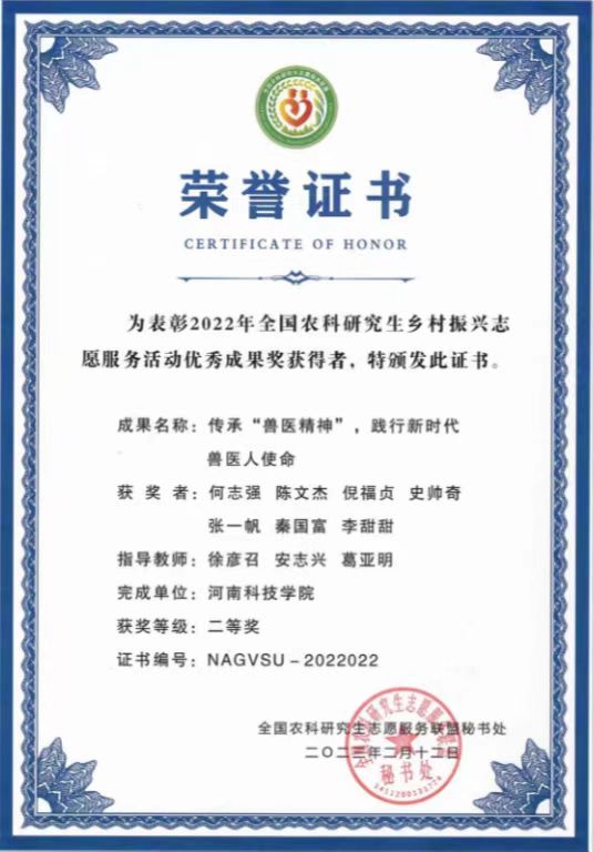 2月11日,2022年全国农科研究生志愿服务活动成果的评选在湖南省长沙市举行。在全国农业专业学位研究生教育指导委员会秘书处的支持与指导下,全国农科研究生志愿服务联盟成员单位共有109项志愿服务活动案例参与申报,最终评选出36项获奖案例。我校动物科技学院研究生代表何志强、陈文杰、倪福贞等申报的“科普创文明”案例荣获优秀案例二等奖,该奖项为我校研究生荣获的首个全国农科研究生志愿服务活动奖项。