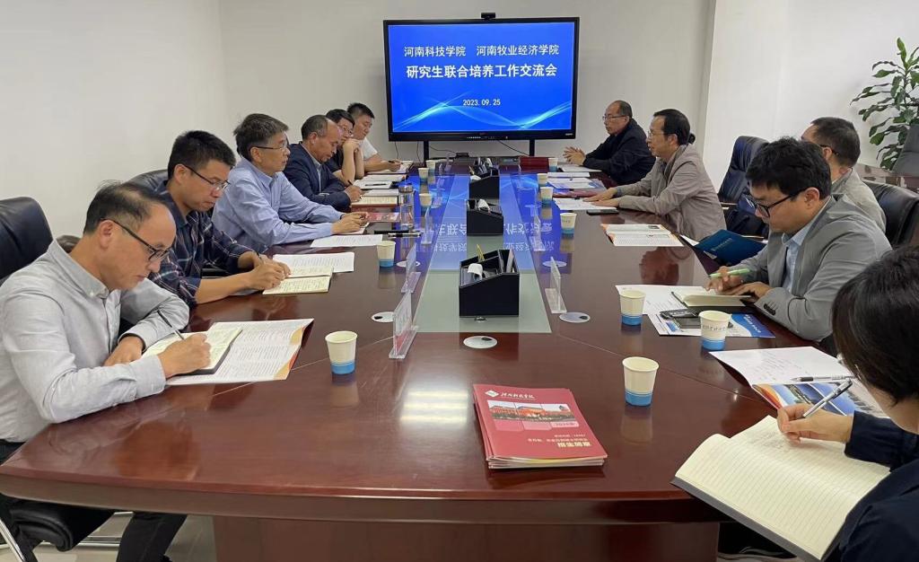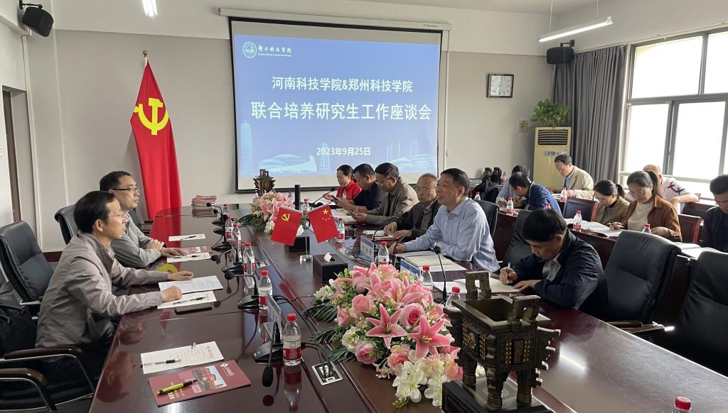 9月25日,李波一行与郑州科技学院副校长刘洲峰、科研处处长杨绪华、科研处副处长兼学科办主任栗全庆和相关学院负责人进行了座谈交流。李波对2024年我校硕士研究生招生专业目录和相关政策进行了解读,回答了与会人员提出的相关问题,并鼓励相关二级学院相关负责人和我校兼职导师积极组织学生报考河南科技学院,并开展联合培养工作。
